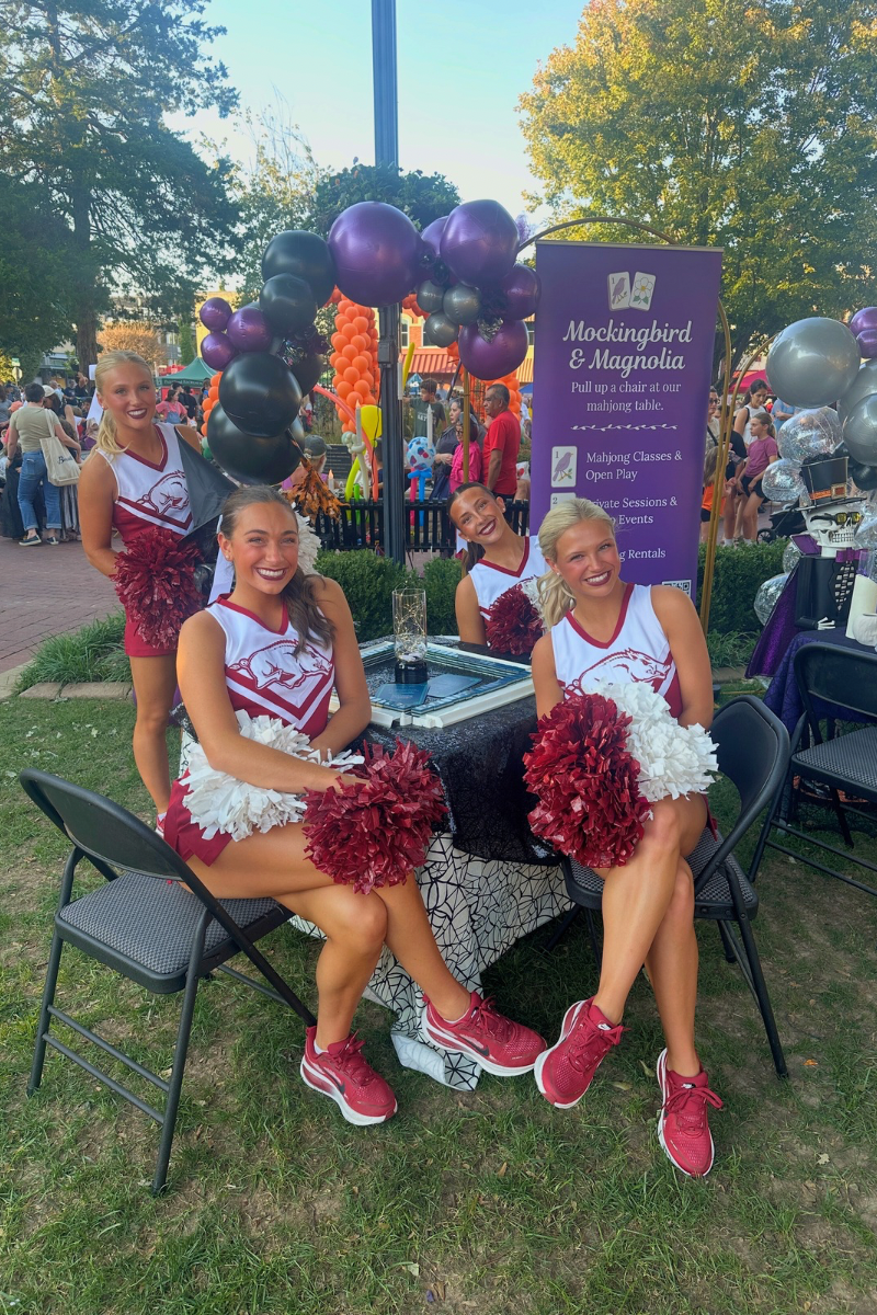 A highlight of the night? When the Razorback Cheerleaders stopped by to take a picture with our setup! (If you’re reading this, call us—we’d love to host a private Mahjong night for the squad!)
