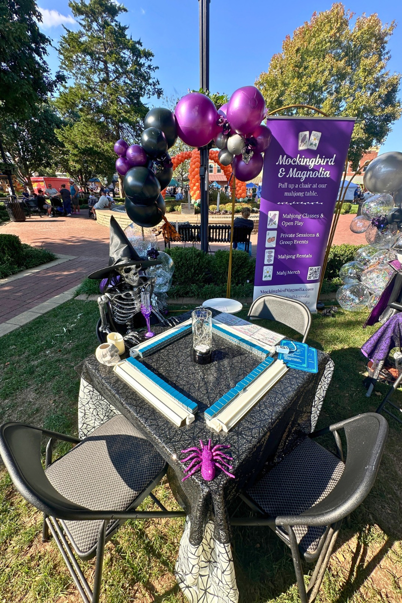 This month’s theme was Haunted Holler, and if you know us, you know we love a theme. So we applied to DBI to host an open-play area where anyone could stop by, chat, and see Mahjong in action—complete with a skeleton sitting in as our fourth player. There was no way they could say no to that. What says Haunted Holler more than skeletons playing Mahjong?